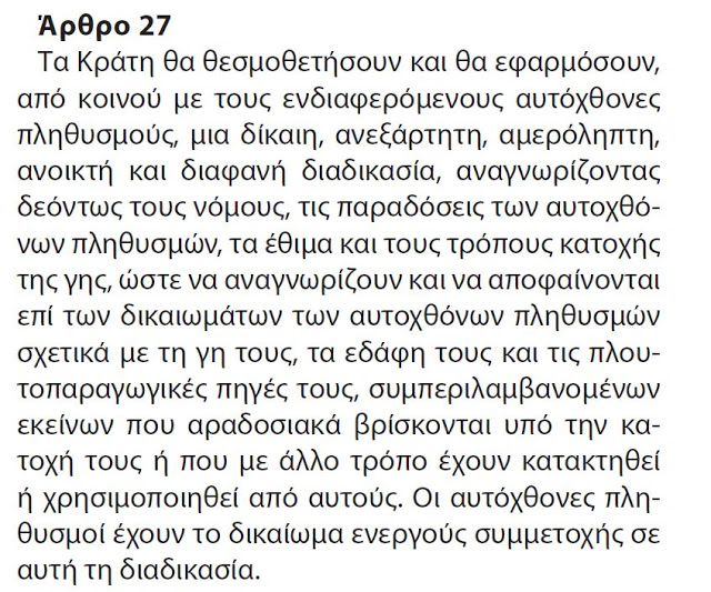 Για να δούμε μερικά άρθρα στις παρακάτω εικόνες, για να δείτε τη σύνδεση που πρέπει να υπάρχει, αλλά και τι οφείλει το κράτος απέναντι στους αυτόχθονες πληθυσμούς. Θα παρατηρήσετε πως ανάλογα με τα δικαιώματα των αυτοχθόνων τα κράτη προσαρμόζονται.. Δεν προσαρμόζονται οι αυτόχθονες με τα κράτη.
